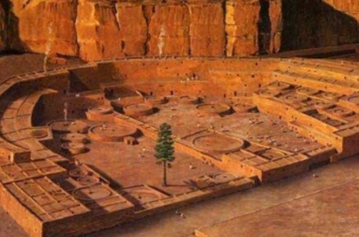 Further: stop saying their egalitarian, because if you ignore everything you know about pueblos and just look at Chaco, you'll find that there are massive palaces (Great Houses) surrounded with tons of peasant homes (five rooms and a kiva). Also, we know, and have known forever, that there was some kind of hierarchy in Pueblo Bonito. In one room, Room 33, they found a burial chamber with two skeletons that were HEAVILY decorated with turquoise beads (like 150,000 beads—75% of all turquoise found in Chaco) and copper bells, and macaw feathers (yes, they apparently had trade networks with the Yucatan). And this burial chamber has 300 years of people represented in matrilineal (mother-to-daughter) descendants. This, Lekson says, is clearly a tomb for the monarchy.